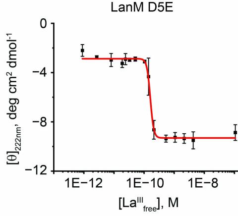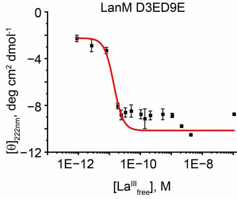 Plot of molar ellipticity at 222 nm versus concentration of free La3+ for LanM D3ED9E bound to lanthanum, used to calculate the LanM D3ED9E-La3+ binding affinity (Kd).