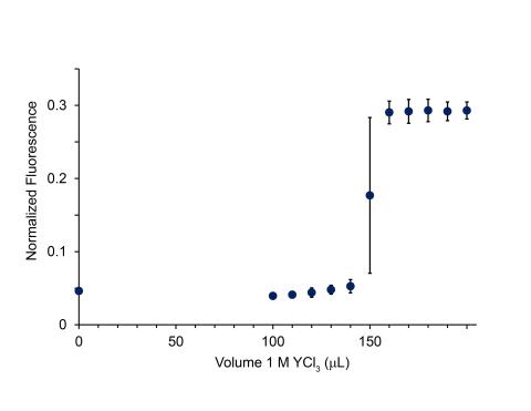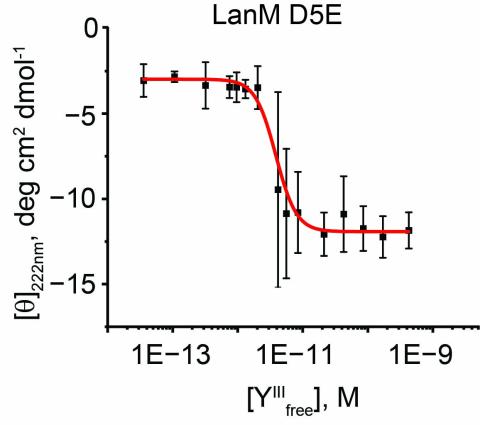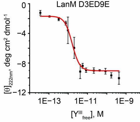 Plot of molar ellipticity at 222 nm versus concentration of free Y3+ for LanM D3ED9E bound to yttrium, used to calculate the LanM D3ED9E-Y3+ binding affinity (Kd).